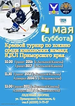 Жители и гости городского округа приглашаем вас на Краевой турнир по хоккею среди юношеских команд ЮХЛ Приморского края - 4 МАЯ в 10:00 !